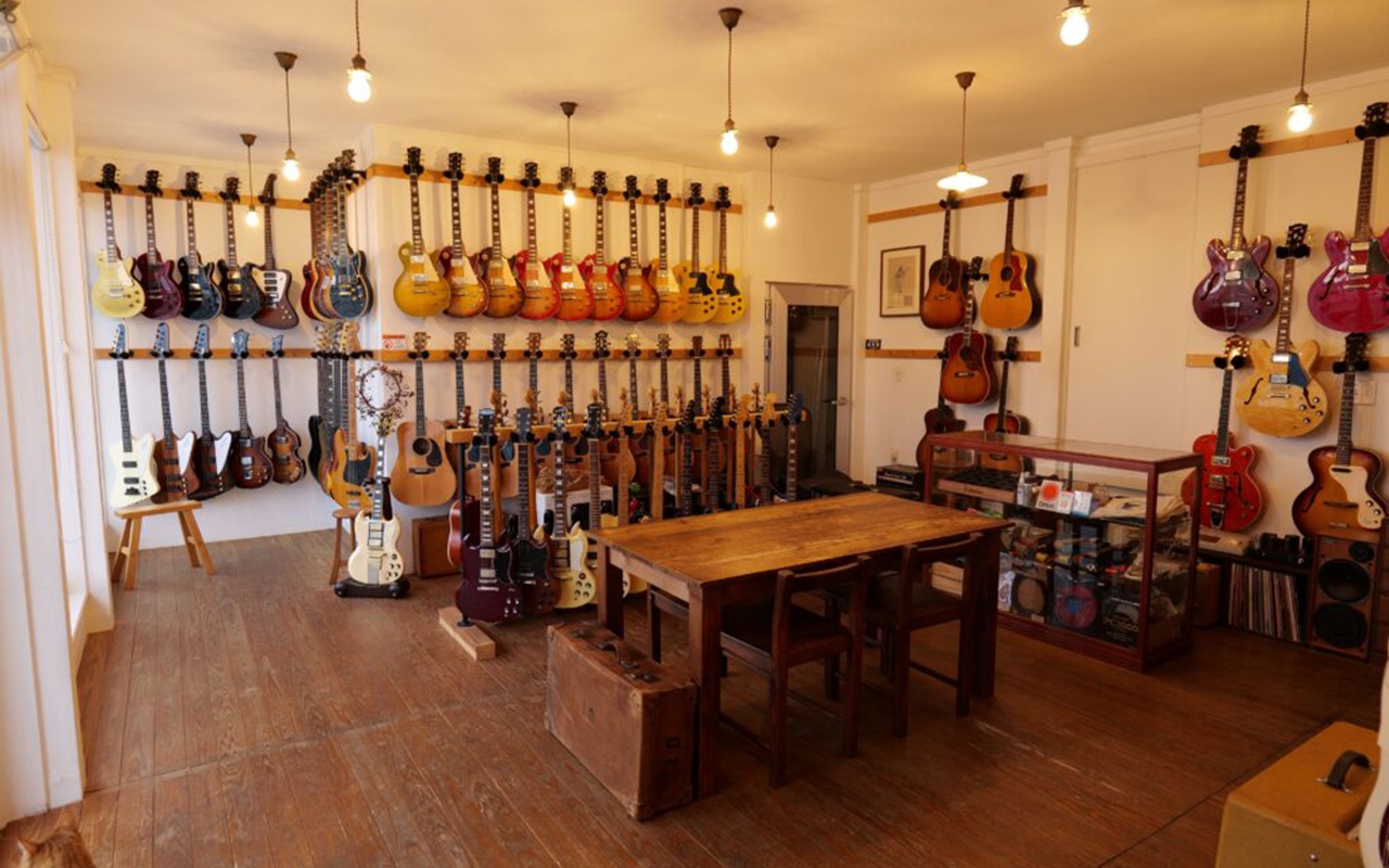 看板猫の「みかん君」が出迎える店内には、1953年製などの貴重なビンテージギターがずらり。HISASHIさんは”運命の再会”を果たしたかのようにギターを手に取り、綾小路翔さんとまさかの即興コラボセッションが実現!音楽好きの2人ならではの、旅のハイライトとなりました。