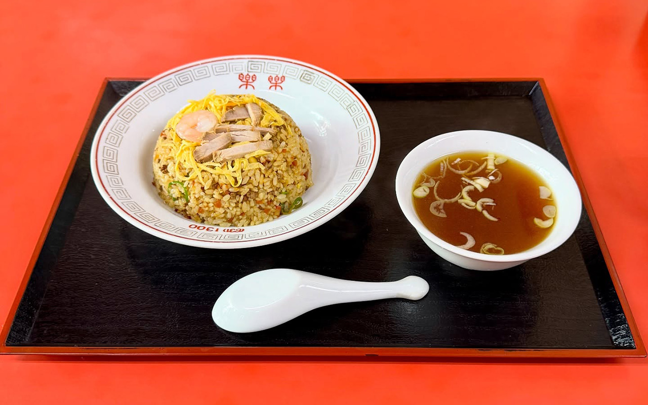 「町中華で飲ろうぜ」でも紹介された人気メニュー。黒い醤油ベースのチャーハンに、錦糸卵、海老、チャーシューが美しく盛り付けられた見た目も華やかな一品です。パラパラというよりは若干しっとりとした昔ながらの食感で、チャーシュー、かまぼこ、にんじんなど具材が豊富。意外とあっさりとした味付けで、老若男女に支持されています。