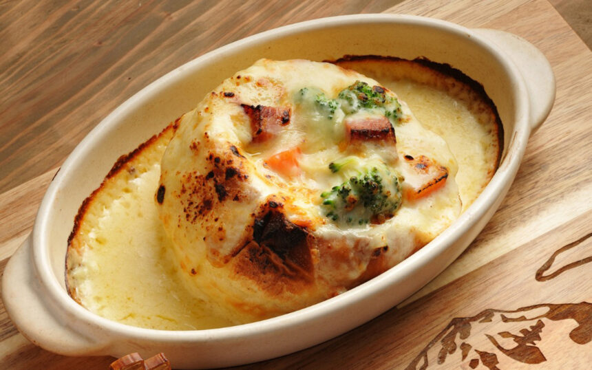 - メニューの魅力: ふわふわのパンを丸ごとくり抜き、大きめにカットした野菜(きのこ、じゃがいもなど)や鶏肉、ベーコンがたっぷりと詰まっています。注文ごとに皿ごとオーブンで焼き上げるため、外はカリッと香ばしく、中はとろーり熱々。絶景を眺めながらのアツアツのグラタンは格別です。