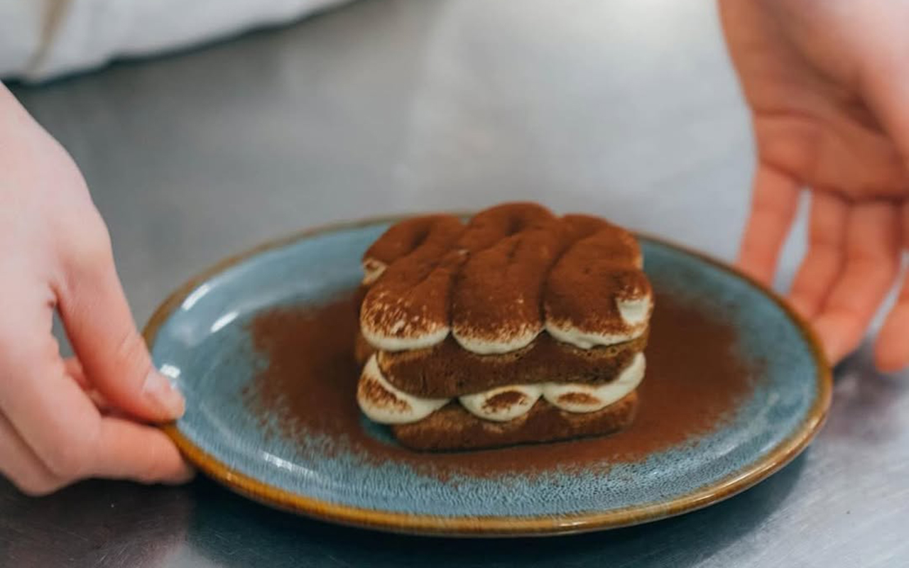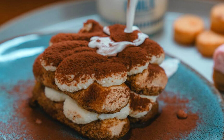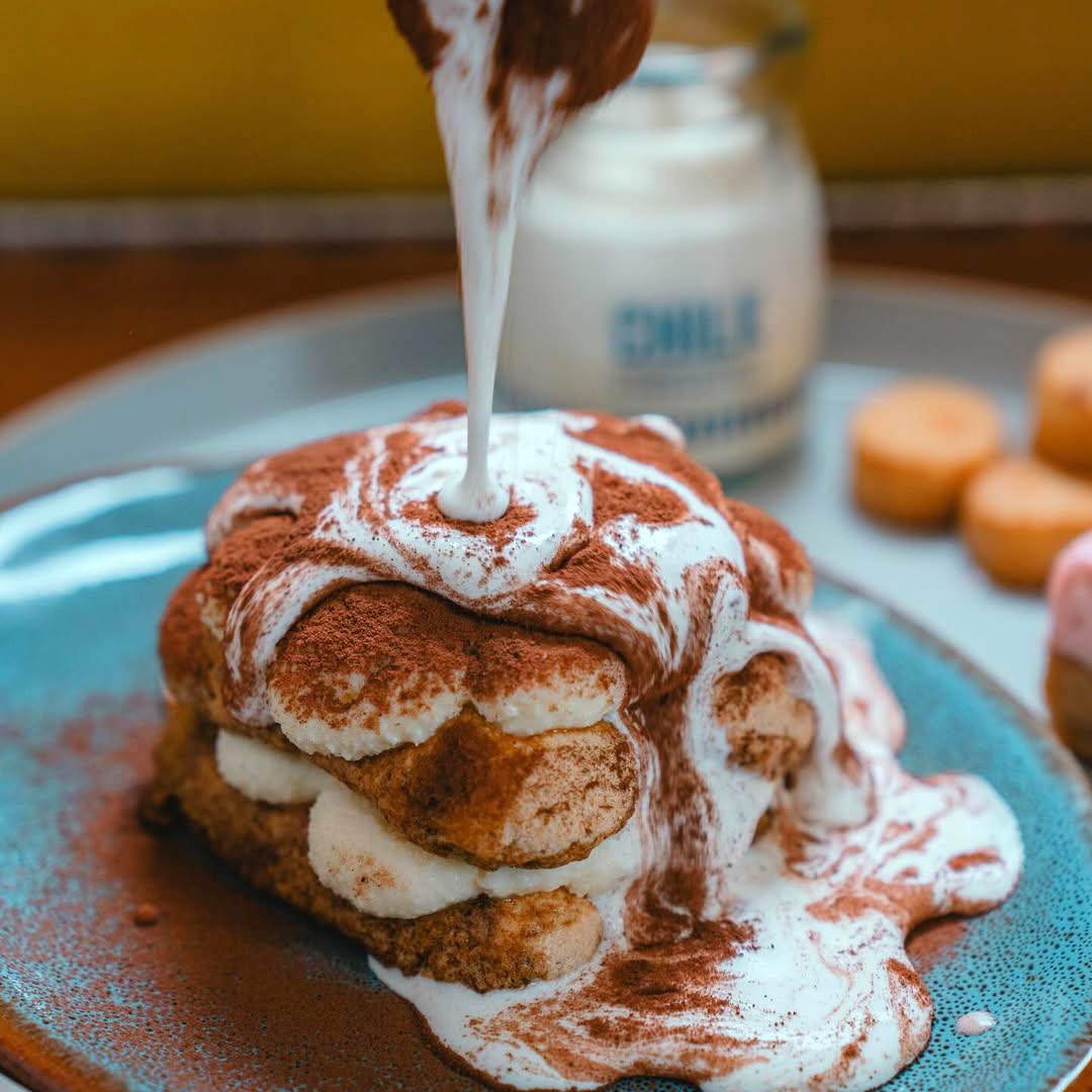 このティラミスの最大の特徴は、別添えで提供される「自家製ミルクソース」。 食べる直前にこのミルクソースを上からかけると、クリームとビスケット生地がソースにひたり、まさに「飲む」ような、とろける食感に変化します。このミルクソースをかける瞬間は、SNSでも「動画映えする」と大バズリ中です。